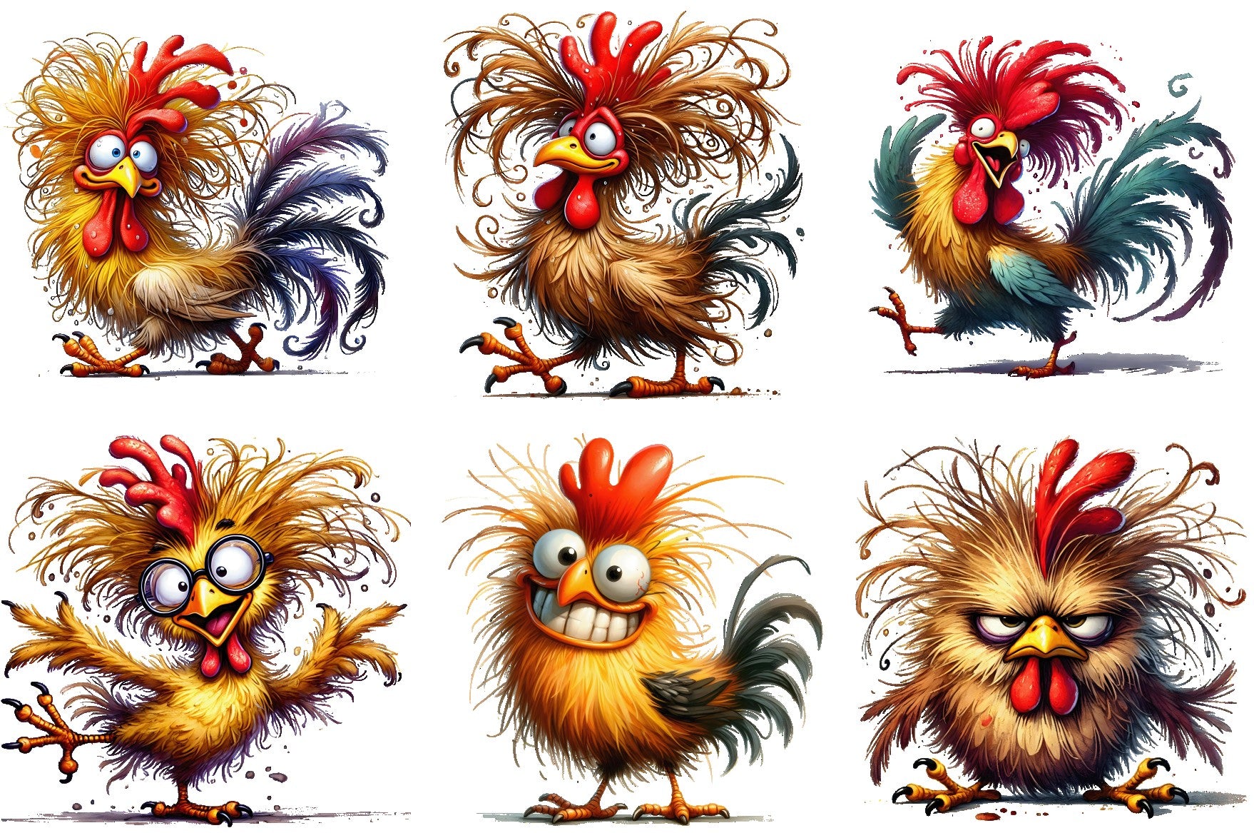 6 Piece 6"x6" Humor Quirky Chickens 100% Cotton Fabric Panel Squares Quilting Blocks
